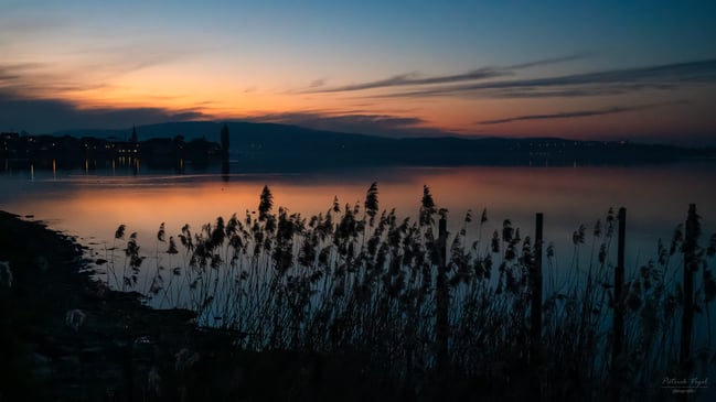 Letztes Licht über dem Untersee bei Berlingen. Auf der anderen Seeseite sind die Lichter von Horn/D zu sehen.