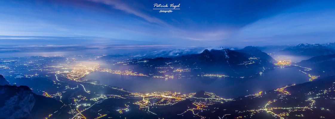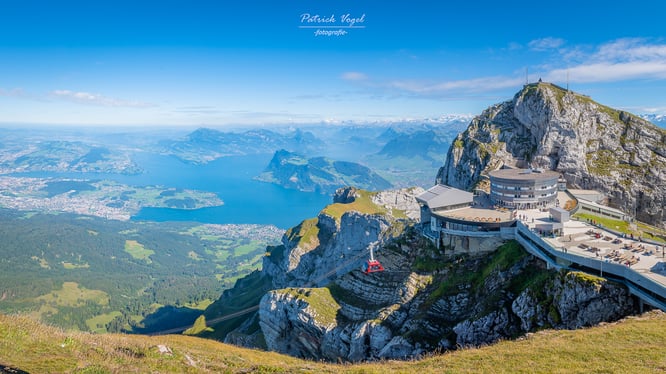 Blick vom Pilatus über Luzern und den Vierwaldstättersee hinüber zur Rigi.