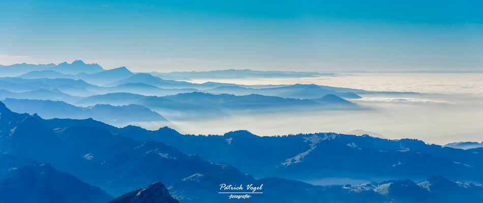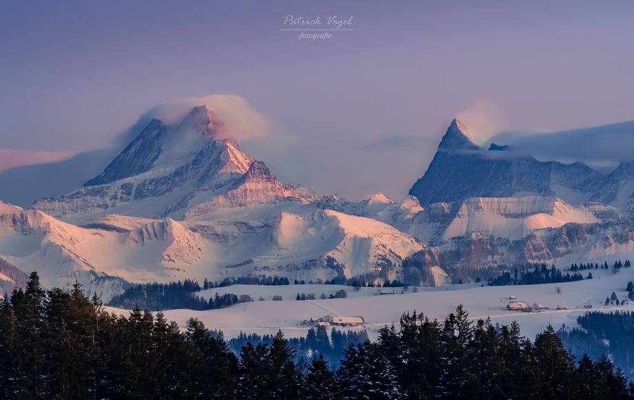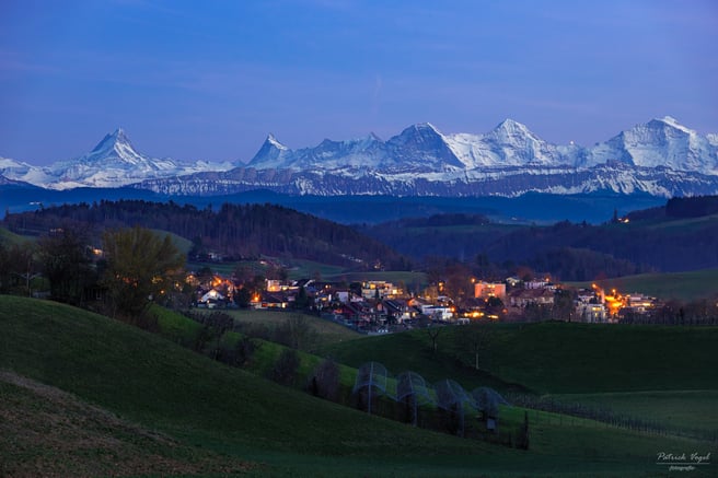 Blick aus dem Emmental in Richtung Berner Oberland. Gute 50 km vom Fotospot bis zu den beiden imposanten Berggipfeln!