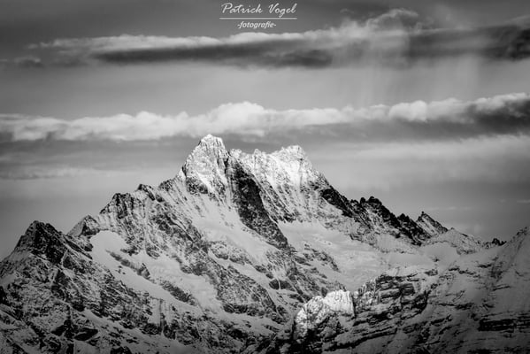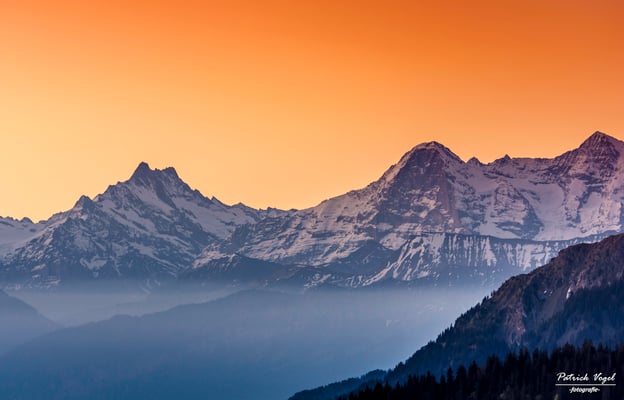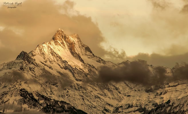 Schreckhorn 4078 m.ü.M und Finsteraarhorn 4274 m.ü.M, in den allerletzten Sonnenstrahlen des Tages!