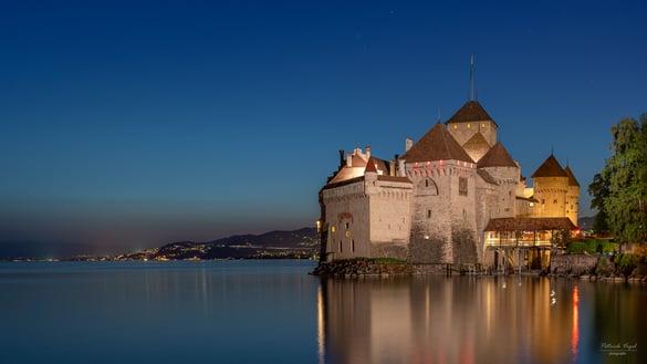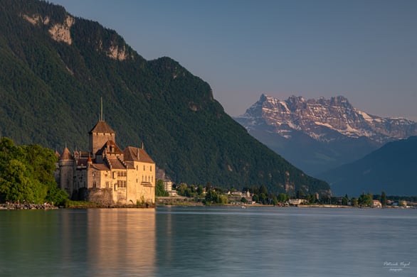 Das stolze Schloss Chillon in der goldenen Stunde am schönen Genfersee. Dahinter die unverkennbaren "Dent du Midi", von der tiefstehenden Abendsonne bereits leicht rötlich scheinend!