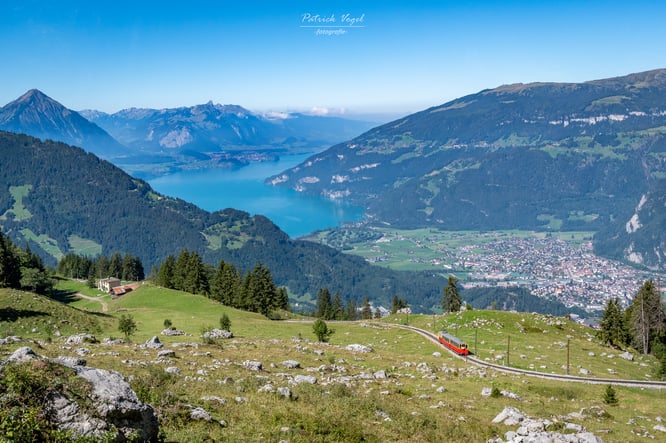 Auf dem Weg auf die Schynige Platte im Berneroberland. Ein Blick zurück lohnt ist immer wieder! Die Sicht reicht von Interlaken über fast den gesamten Thunersee, vorbei am Niesen und Stockhorn und dem gegenüberliegenden Niederhorn, bis beinahe nach Thun.