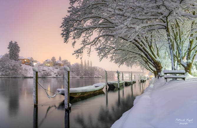 Die Schaffhauser Rheinpromenade tief verschneit! Heute Morgen, Freitag, 15. Januar 2021, kurz nach 07:00 Uhr... gute 25 - 30 cm Neuschnee!
