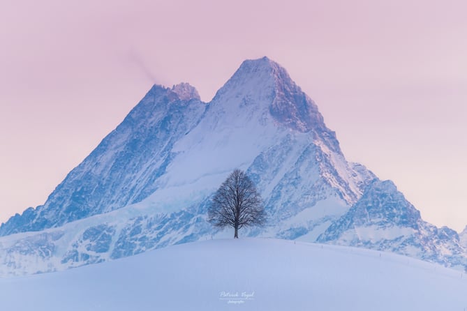 Schreckhorn im BernerOberland hinter einem tollen Solitairbaum im Emmental, im letzten zarten Abendrot ende Januar 2021