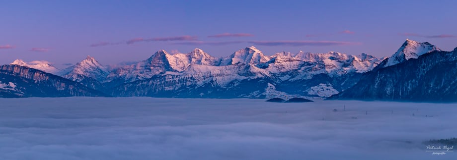 Schreckhorn, Eiger, Mönch und Jungfrau, und ganz links der Niesen. Der Thunersee und seine angrenzenden Gemeinden liegen unter einer dicken Nebeldecke.