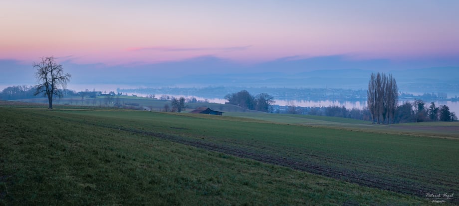 Blaue Stunde oberhalb von Tägerwilen, mit Blick über die Halbinsel Reichenau / D und den Untersee.
