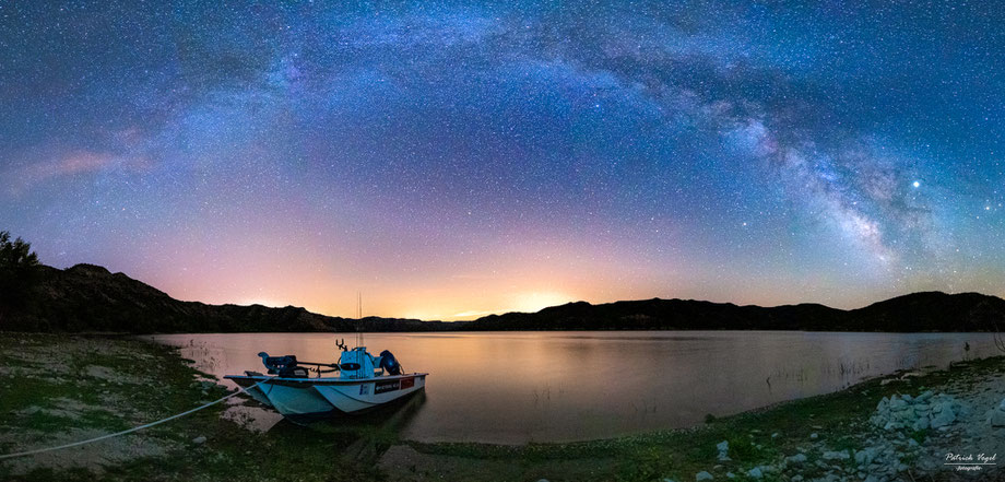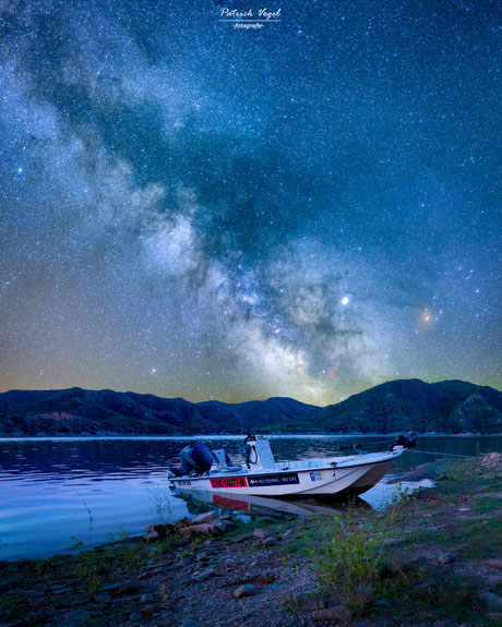 Sommermilchstrasse über dem spanischen Rio Ebro am Embalse de Mequinenza, mit dem Boot unseres Angelguides.
