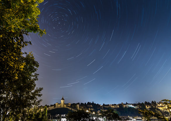 Startrails über Schaffhausen. Der Stern Alkaid lief hinter dem Munotturm durch.