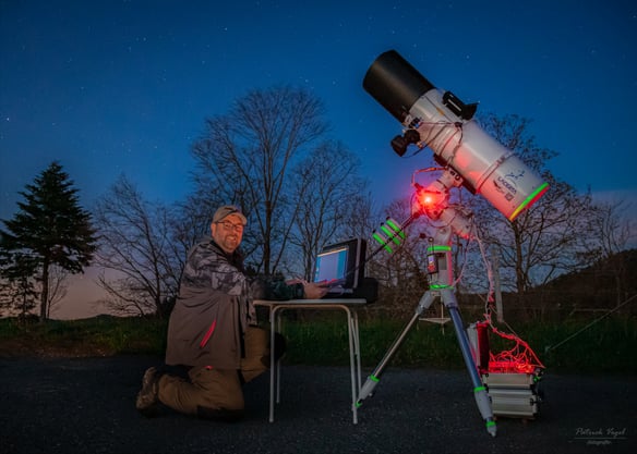 Meine EQ-6R Montierung mit dem aufgesetzten Fotonewton 250/1000 von Lacerta im Einsatz. Einem MGen3 als Guider und der Nikon D7200a als Aufnahmekamera. Betrieben wird das Ganze durch die rot erleuchtete Powerbox.